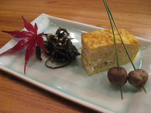 右から、むかご塩ゆで・厚焼き玉子・切り昆布煮。