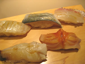 J.C.は、平目・小肌・真鯛・黒みる・赤貝の順に