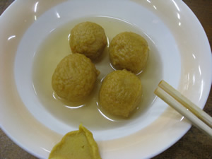 おでんつゆがヒタヒタの皿にボールが4個、