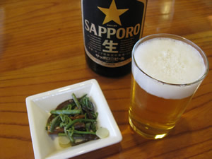酒はビール、肴は鶏肉のぬきをチョイスする。