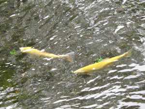 湧玉池には虹鱒が群れを成して泳いでいる。