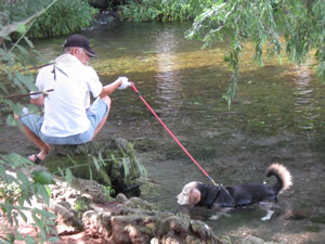 虹鱒の群れる冷水に浸かっているワン公がいるではないか。