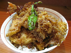 丼の内容は、海老・いか・きす・蓮根・かぼちゃ・しし唐。