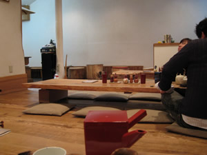 入れ込みの板の間で胡坐をかいている。