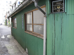 緑のトタンが強い印象を残す