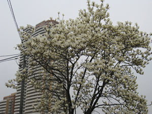 高層ビルと木蓮の対比が美しい