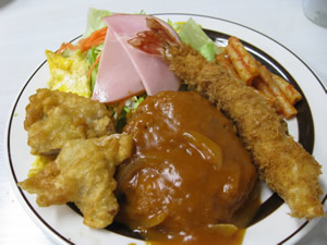 七福の(上)はハンバーグ・ハム・海老フライ・鳥唐揚げ。