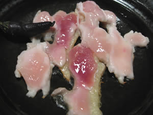 鶏すきは牛すき焼きのごとく、溶き玉子にくぐらせる。