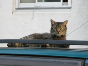 近づくと駐車中のライトバンの屋根に猫が3匹。