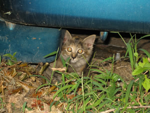 人の気配に仔猫たちは駆け下りてバンの下に隠れたが