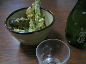 黄桜の1合瓶とともに小鉢の天ぷらが運ばれた。