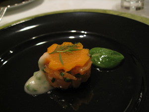 前菜はサーモンのタルタル。