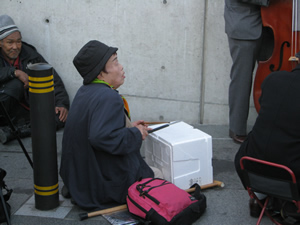 発泡スチロールをドラムに見立てたヘンなオバさん