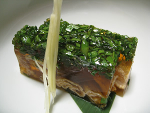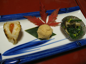 左から焼き帆立いくら射込み、たら子含め煮、とんぶり若布。